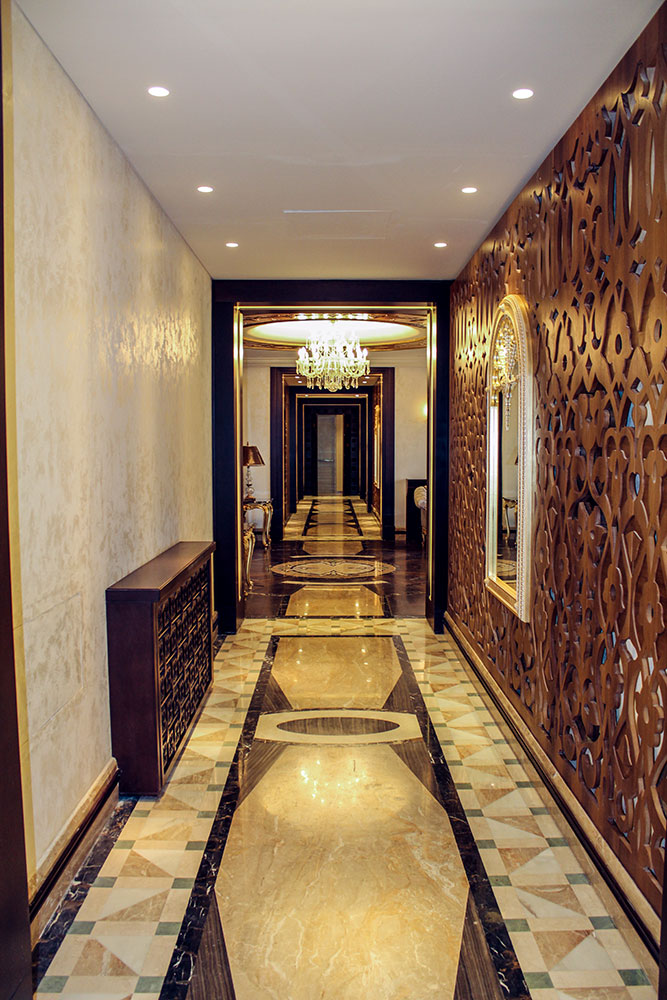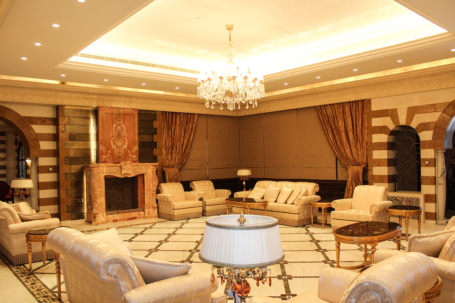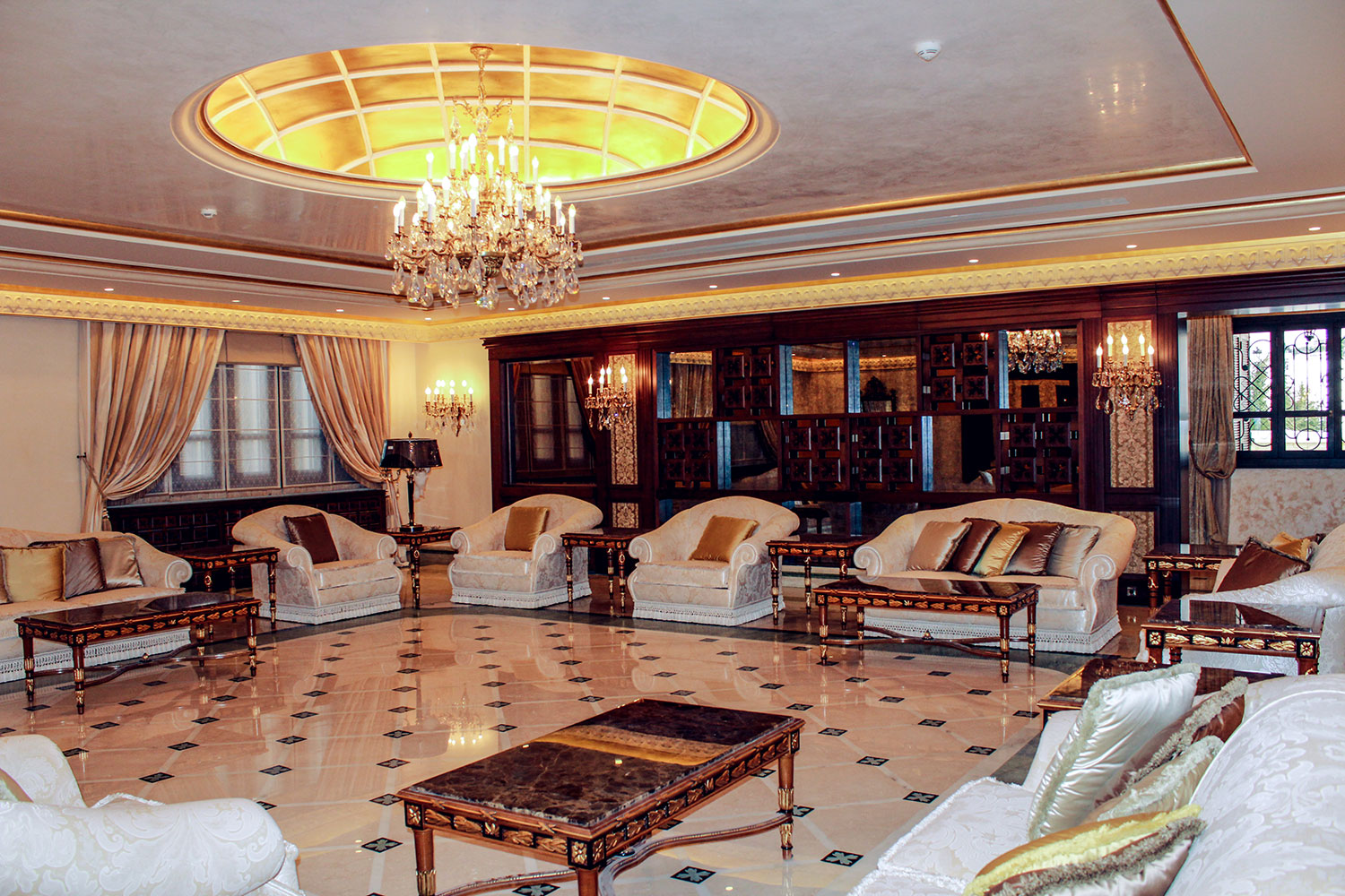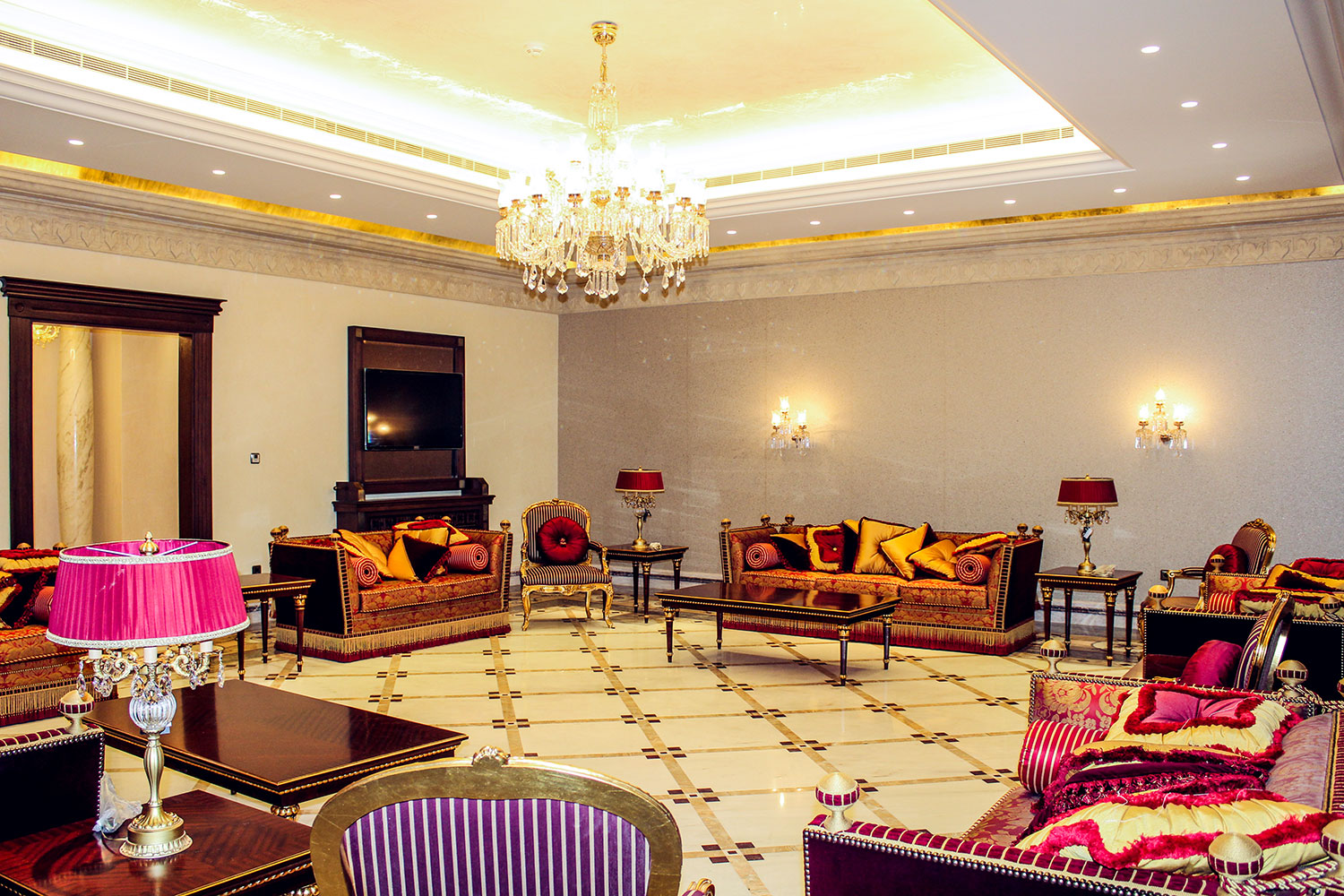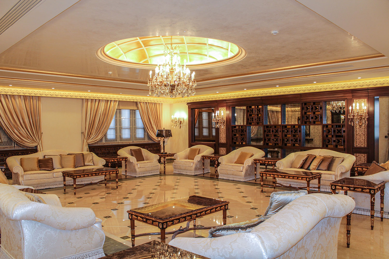 Rayyan Palace covers approximately 3,000 square meters of built-up area, split equally into three stories. The spacious ground floor is designed to receive guests on formal occasions. The middle floor is a family reception with living space and two guest rooms. On the upper floor is a private zone for ‘Her & His Highness’ bedrooms and other services, annexes and assistants’ rooms. There are also two private bedrooms for close family members and special guests.
